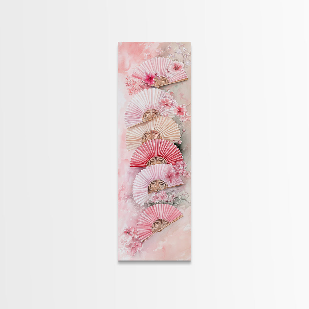Cherry Blossom Fan Arrangement Canvas Print - Pink Wall Art, Chinoiserie Art, Cottagecore Decor, Long Narrow Wall Art, Living Room Art