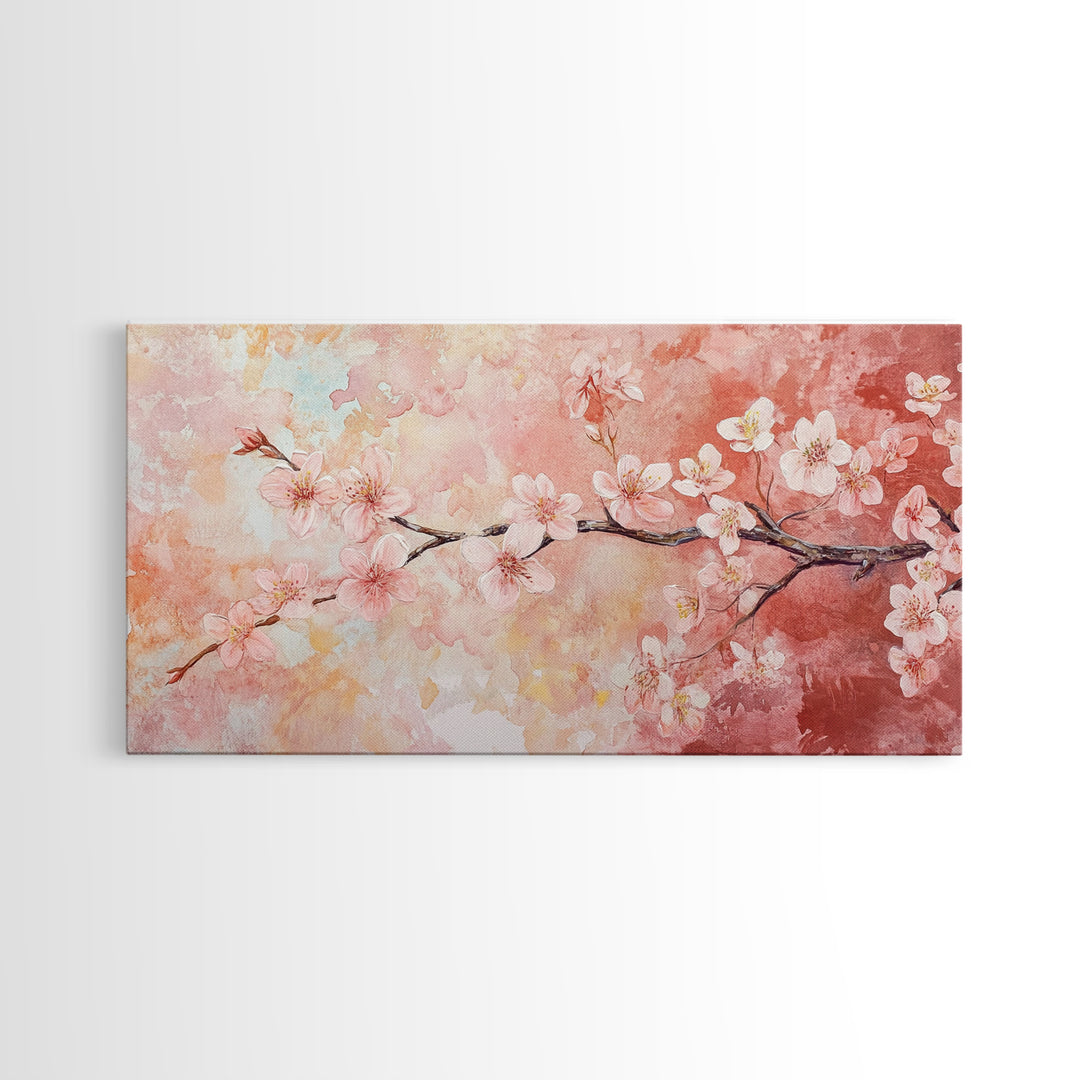 Cherry blossom painting, coastal decor, framed canvas print, minimalist art, abstract landscape, extra wide art, horizontal wall art