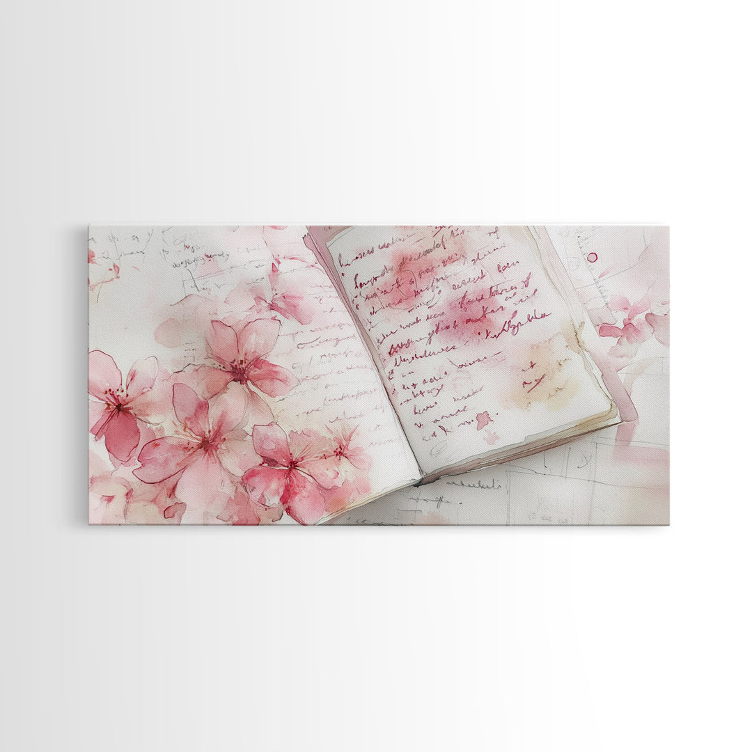 Cherry Blossom Journal Canvas Print | Whimsical Pink Wall Art | Cottagecore Framed Canvas Print | Feminine Writing Room Art