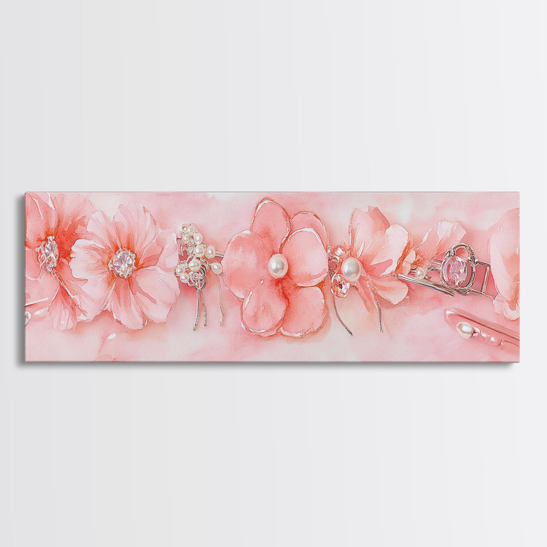 Cherry Blossom Canvas Print with Delicate Pearl Accents, Romantic Light Pink Wall Art for Bedroom or Coastal Wedding Decor