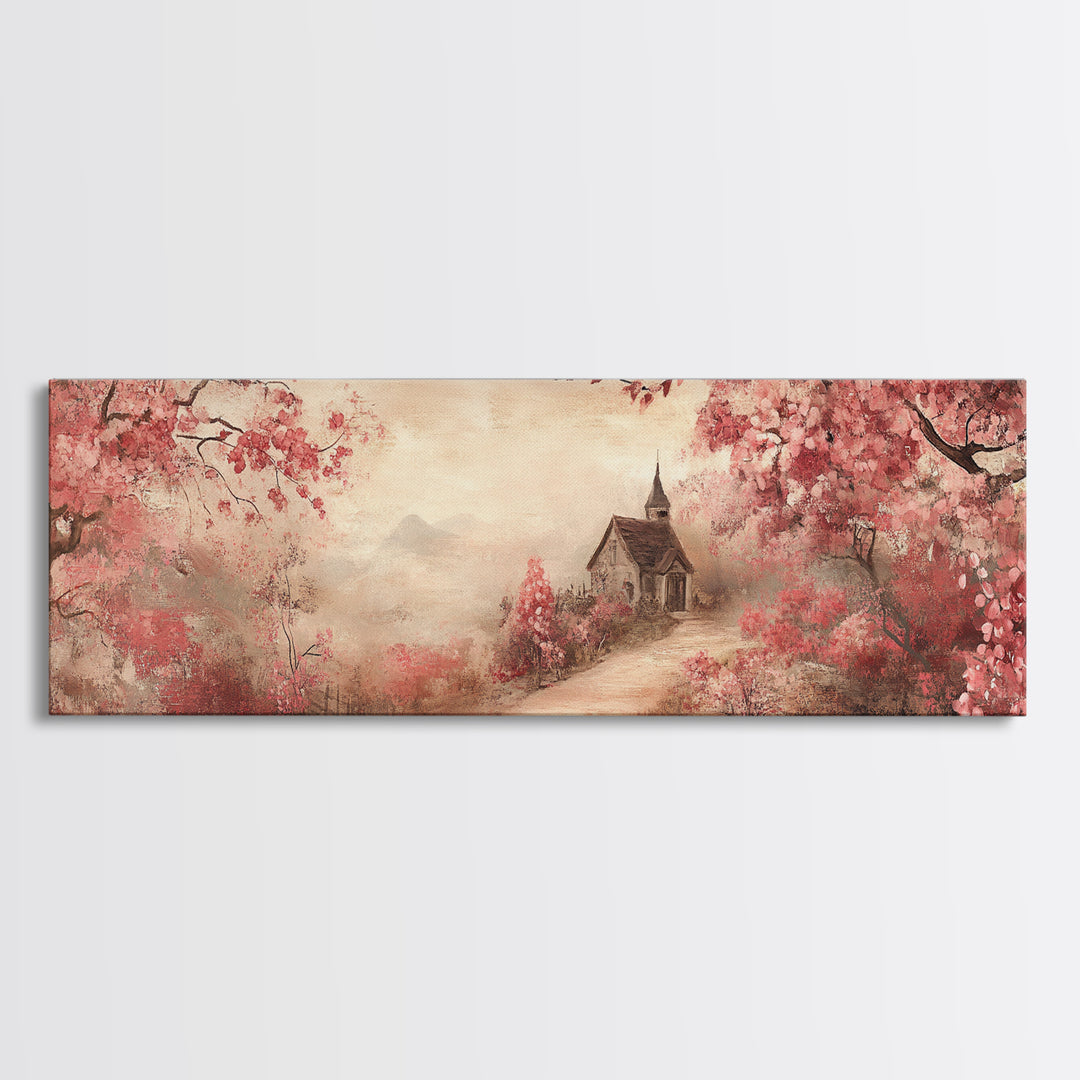 Cherry Blossom Church Scene Framed Canvas Print – Cherry Blossom Painting, Panoramic Art, Rustic Wall Art, Cottagecore Wall Art, Fall Decor