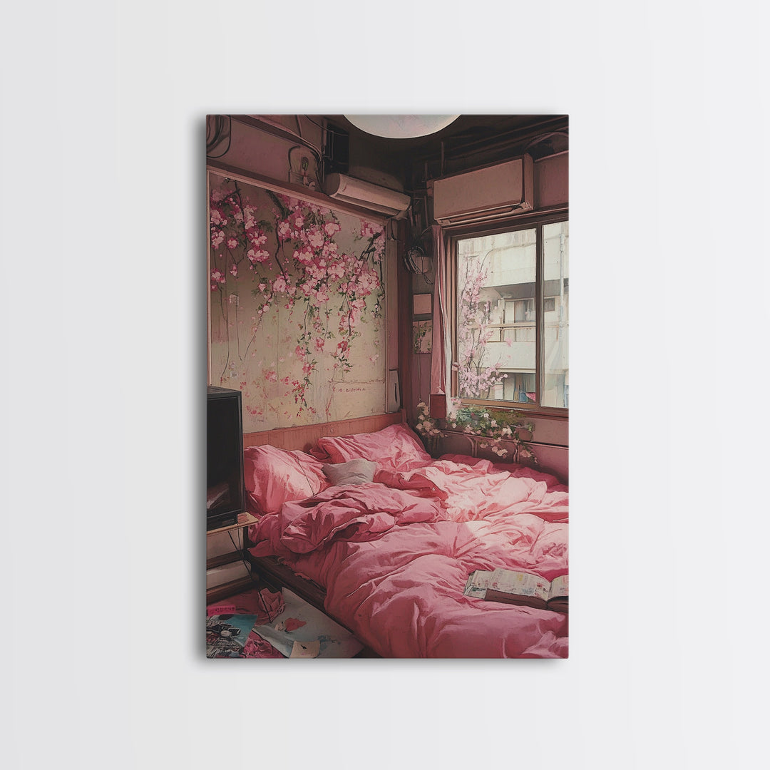 Cherry Blossom Dream Framed Canvas Print Light Pink Japanese Inspired Bedroom Art Cozy Home Floral Wall Decor Feminine Artwork Gift