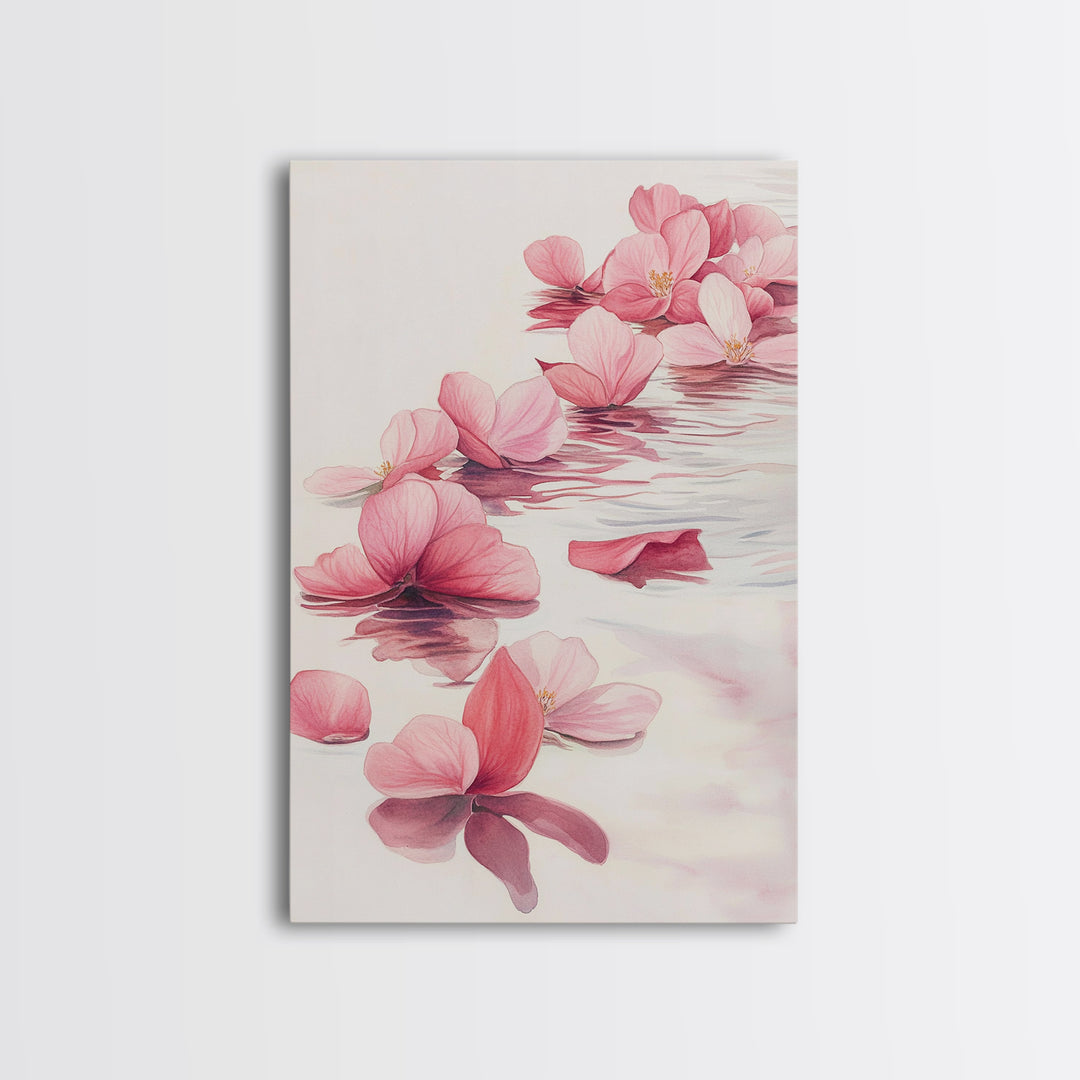 Cherry Blossom Canvas Print Framed Floating Petals Wall Art with Rustic Decor Cottagecore Aesthetic Bedroom Accent Light Pink Style