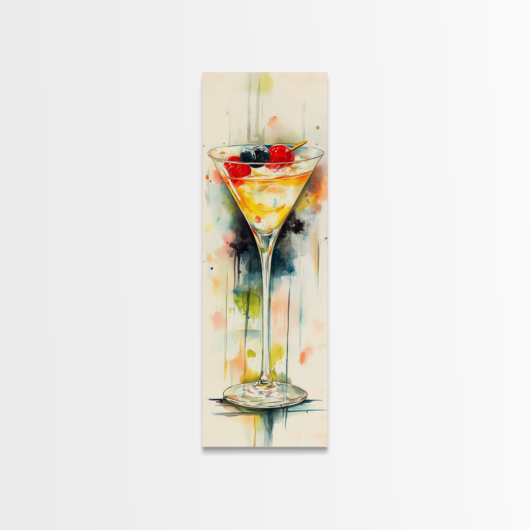 Cherry Martini Watercolor Canvas Print, Whimsical Food Review Kitchen Art with Fun Cocktail, Skinny Vertical Art for Home Bar Decor