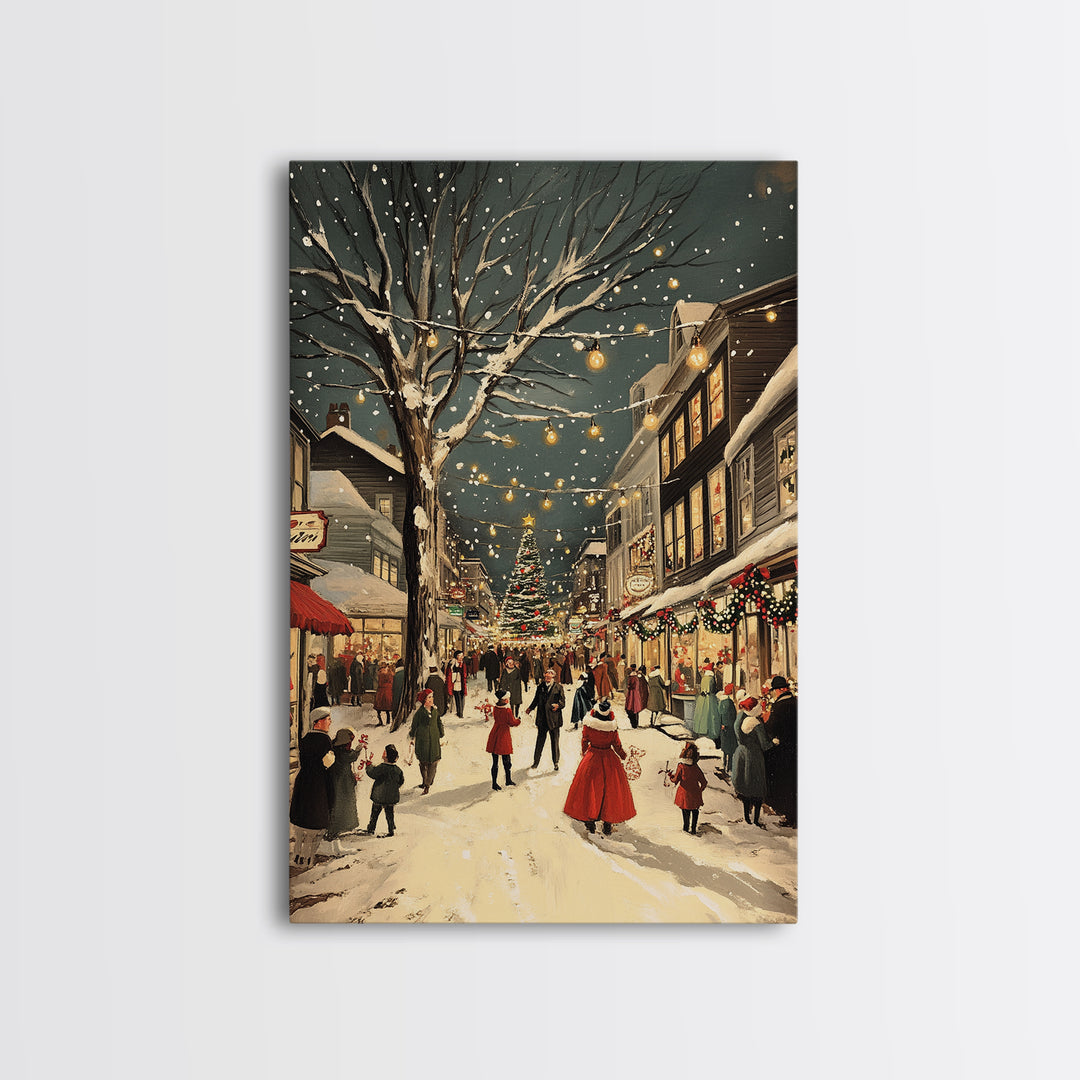 Christmas Eve on The Town Square Framed Canvas Print, Christmas Mantle Art, Wood Framed Canvas Art, Retro Christmas Decor, Vintage Christmas