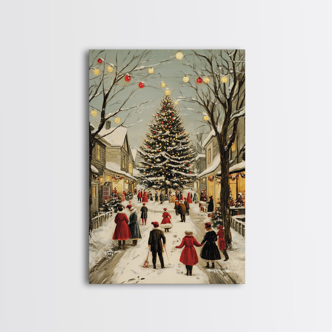 Christmas Tree in Town Square Framed Canvas Print, Wood Framed Wall Art, Vintage Christmas Art Print, Retro Christmas Home Decor