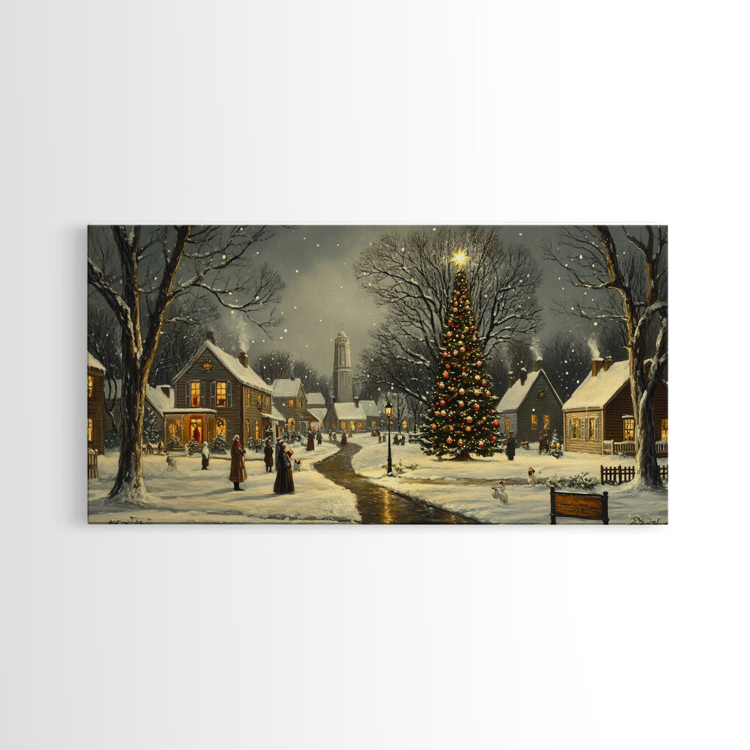 Christmas Sceneary Wall Art Framed Canvas Print, Winter Wall Art, Christmas Village Painting, Victorian Christmas Oil Painting, Horizontal Art