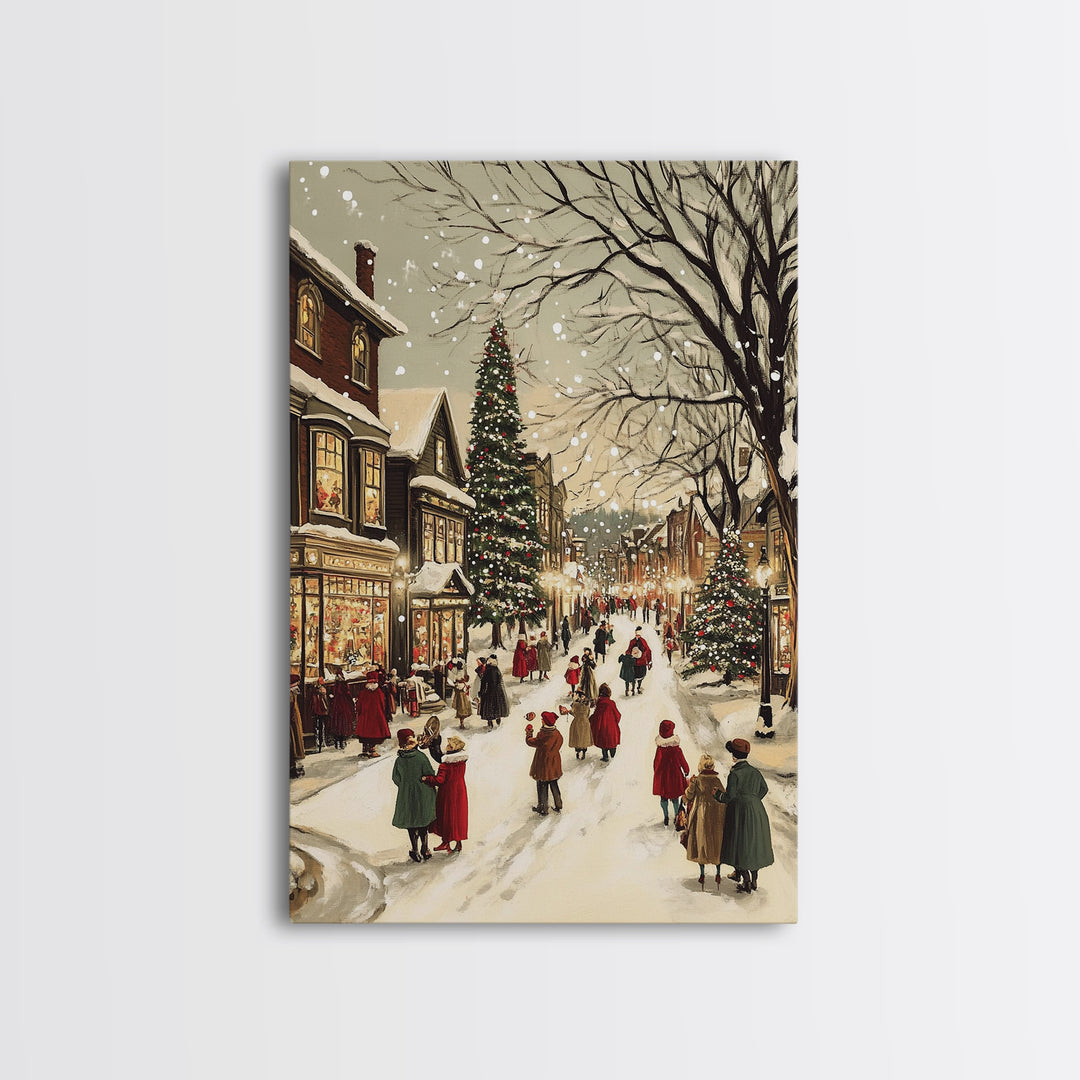 Christmas Village Wall Art, Christmas Shoppers Shopping Framed Canvas Print, Vintage Christmas Home Decor, Christmas Seasonal Wall Art
