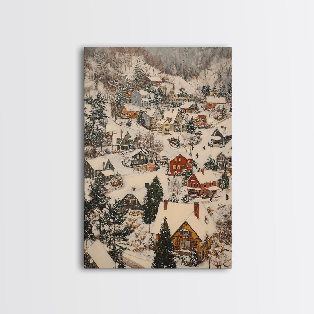 Christmas Village Winter Wonderland Canvas Print, Framed Wall Art, Christmas Decor, Retro Christmas Oil Painting, Christmas Art