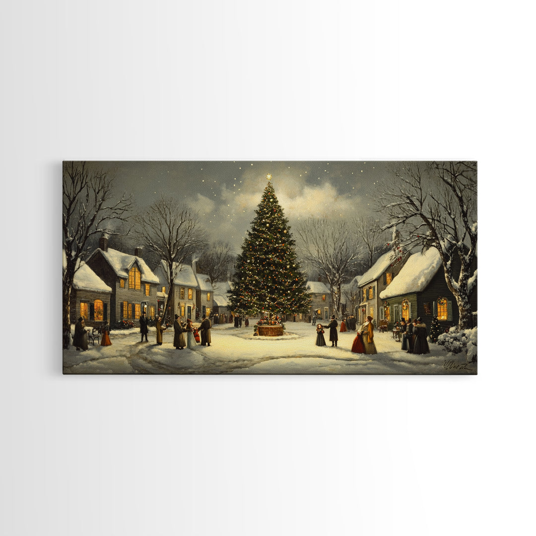 Christmas Village Tree Lighting Framed Canvas Print, Nostalgic Winter Holiday Art, Vintage Wall Art Scene, Best Gift Idea Christmas Decor