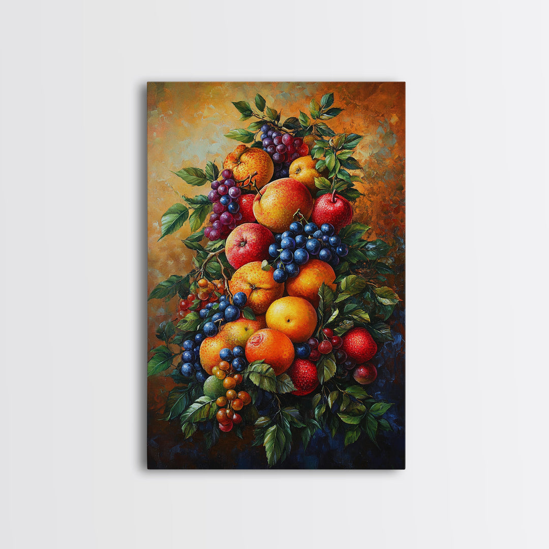 Classic Fruit Still Life Canvas Print with Whimsical Farmhouse Art, Rustic Cottagecore Kitchen Decor, Vibrant Food Review Wall Ar