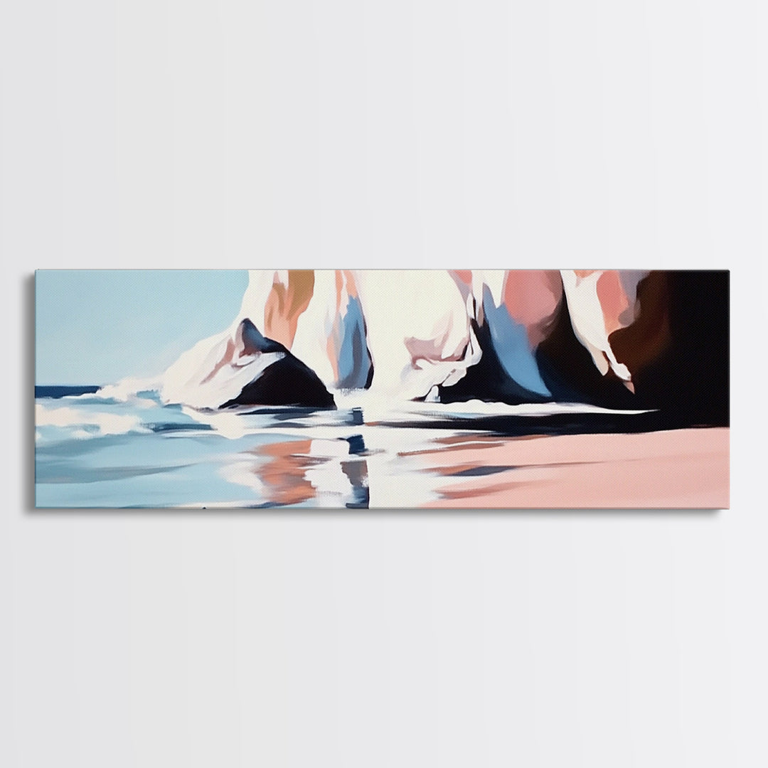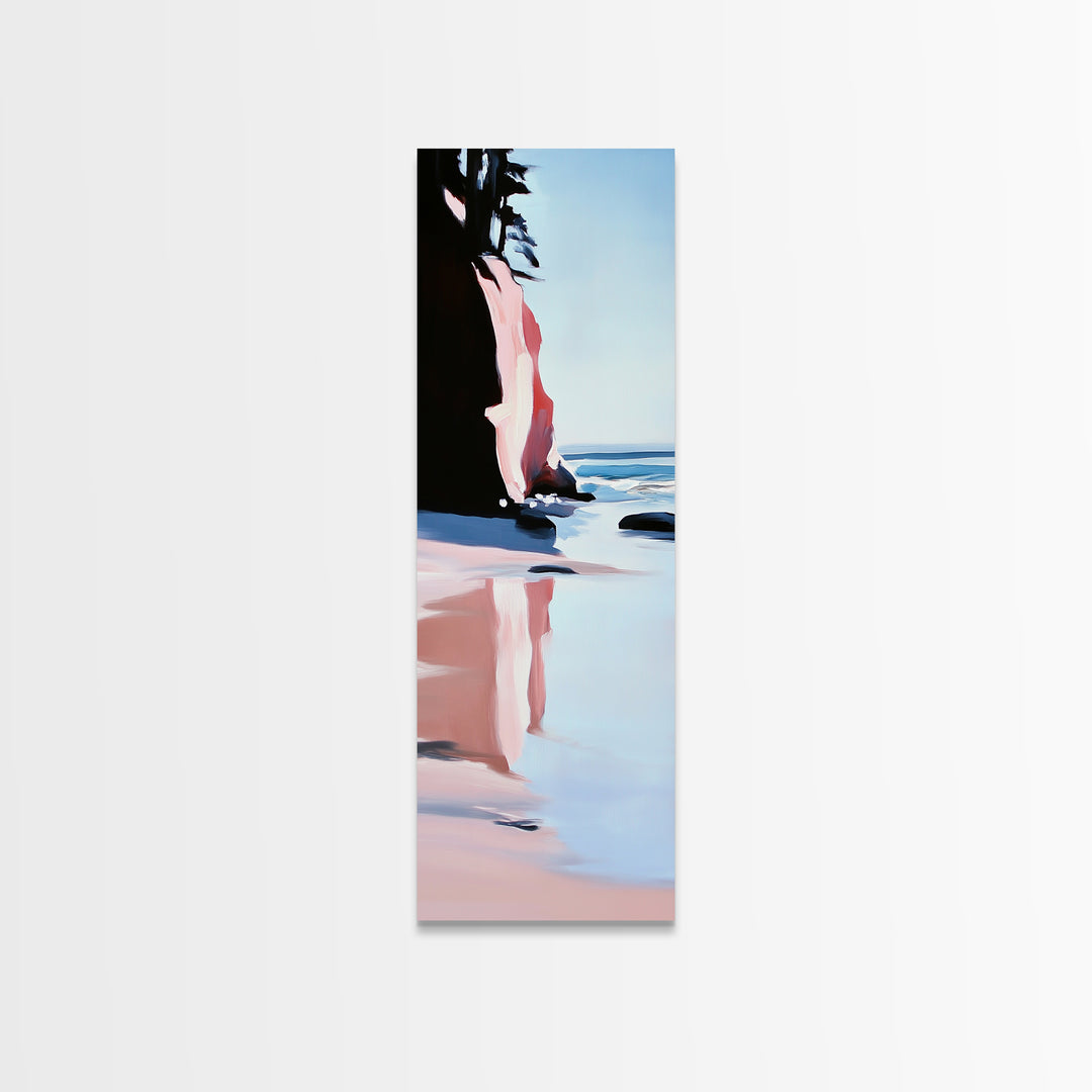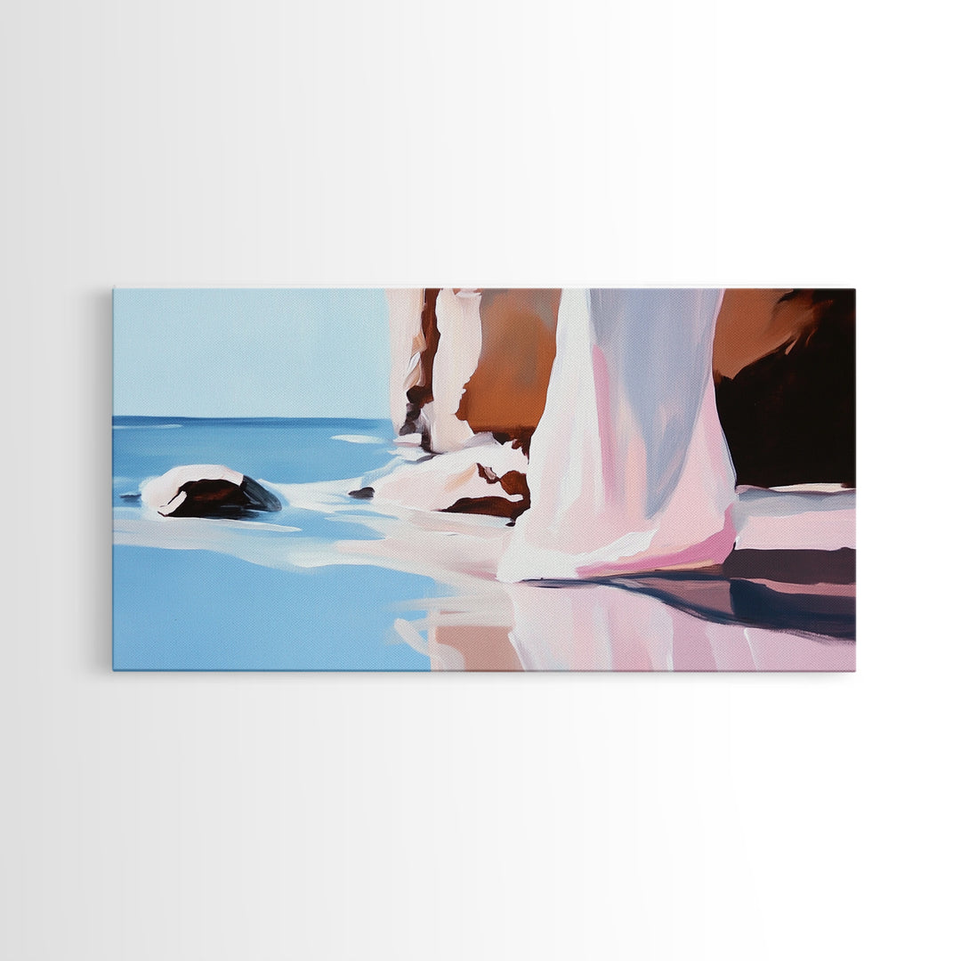 Cliffside View, Tranquil Waters, Framed Canvas Print, Coastal Wall Art, Minimalist Landscape, Serene Home Decor, Blue and Blush Tones