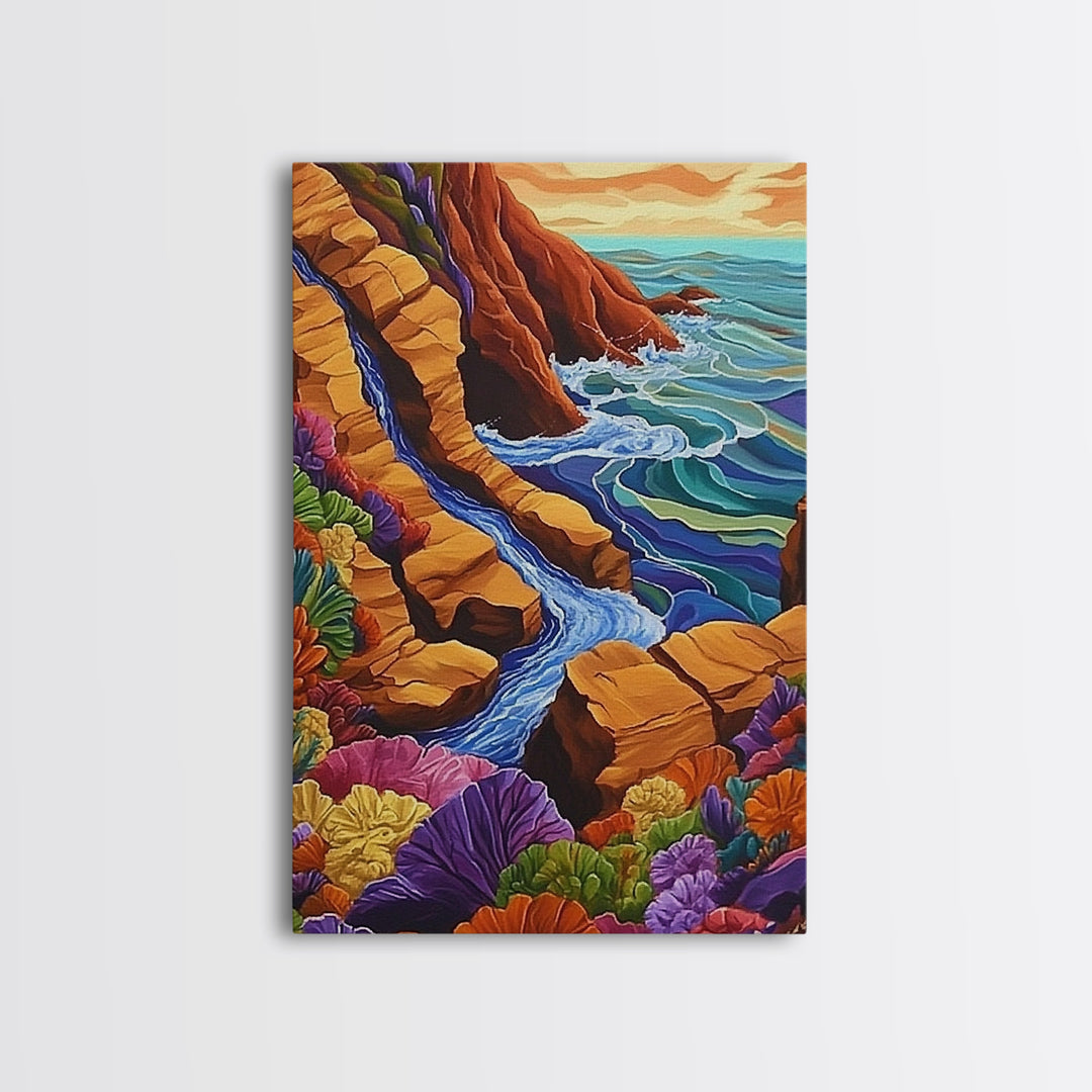 Cliffside Waterfall, Ocean Crashing, Floral Coast, Bold Colors, Framed Canvas Print, tropical wall art, vibrant coastal art, living room decor