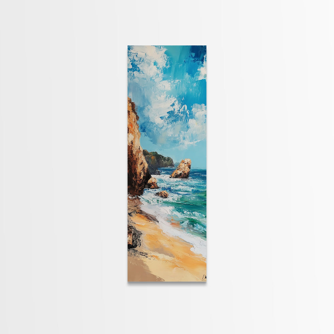 Coastal Beach Watercolor Painting - Framed Canvas Print, Skinny Tall Art, Wall Art for Living Room, Bedroom Decor, Beach Scene Art, Ocean View Print