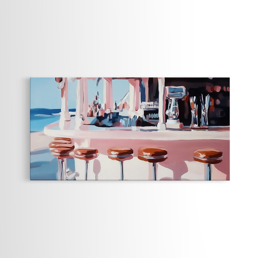 Coastal Bar, Retro Diner, Beach Cafe, Seaside Decor, Framed Canvas Print, Vintage Aesthetic, Pastel Colors, Kitchen Wall Art, Nautical Art