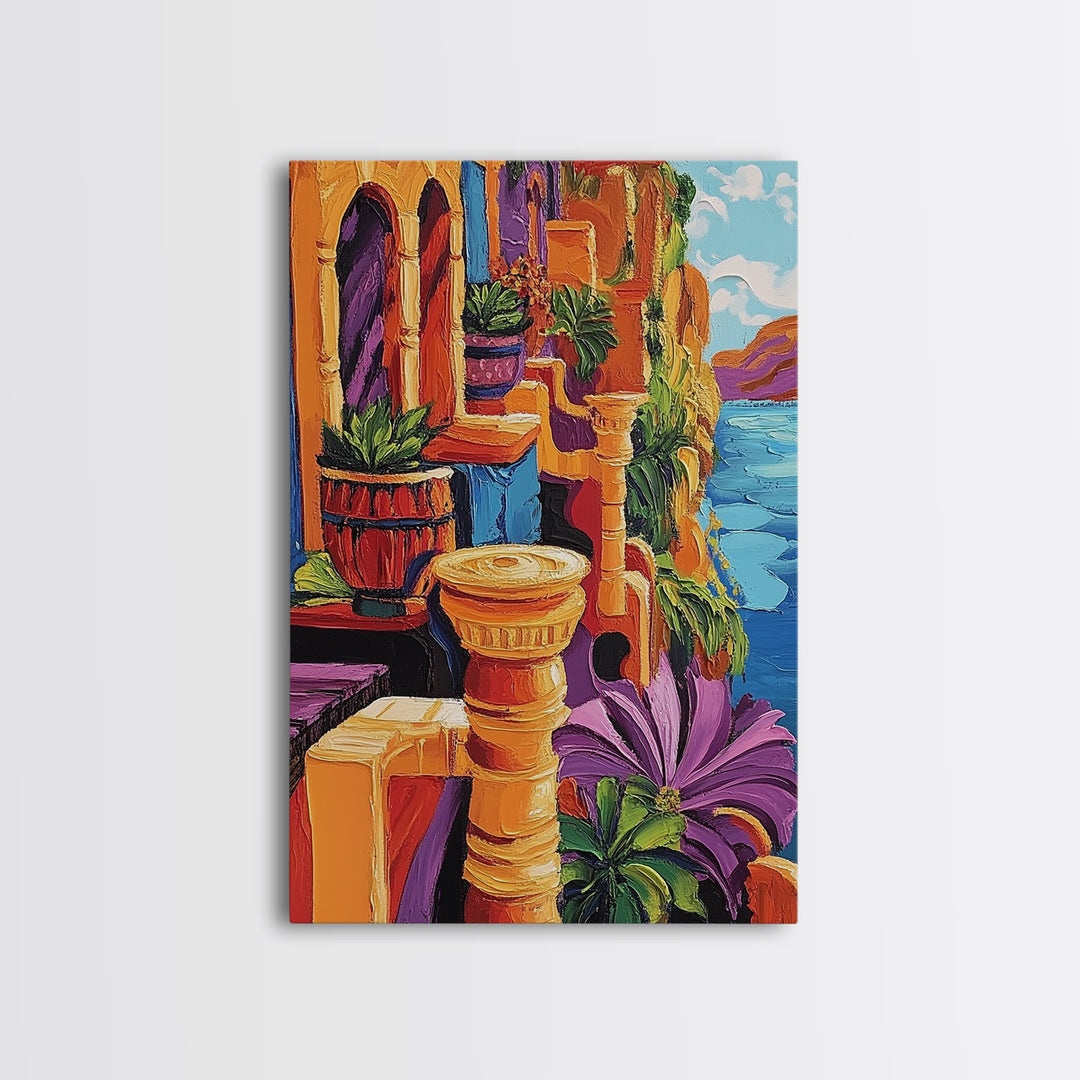 Coastal Balcony Art, Vibrant Waterscape Decor, Framed Canvas Print, Mediterranean Home Art, Patio Wall Decor, Colorful Living Space