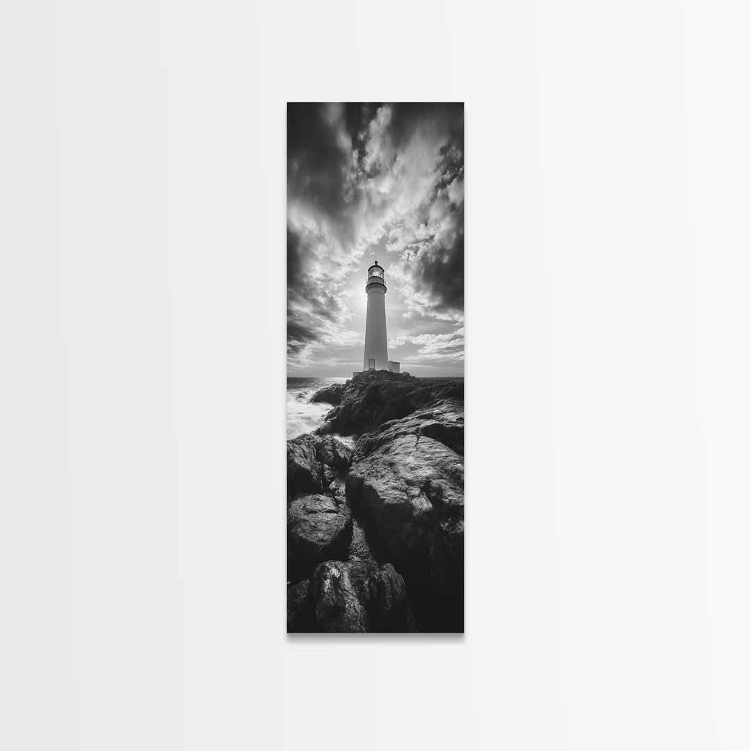 Coastal Beacon, Nautical Light, Ocean Landscape, Sunset Sky, Lighthouse Photography Framed Canvas Print, Living Room Nautical Wall Art