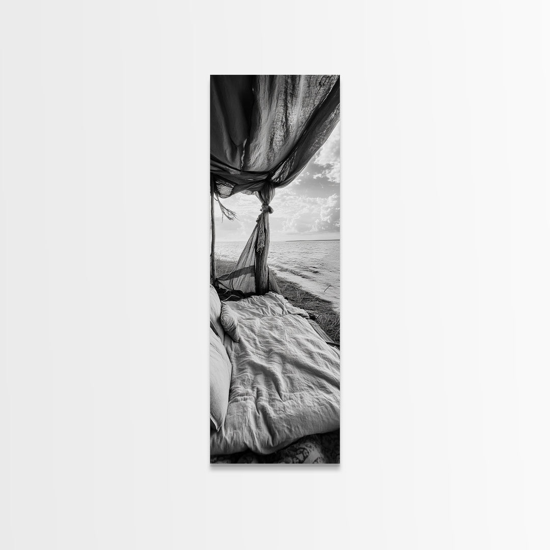 Coastal Bed View, Ocean Canopy, Seaside Rest, Framed Canvas Print, Boho Bedroom Wall Art, Rustic Beach Photography, Nature Retreat Decor