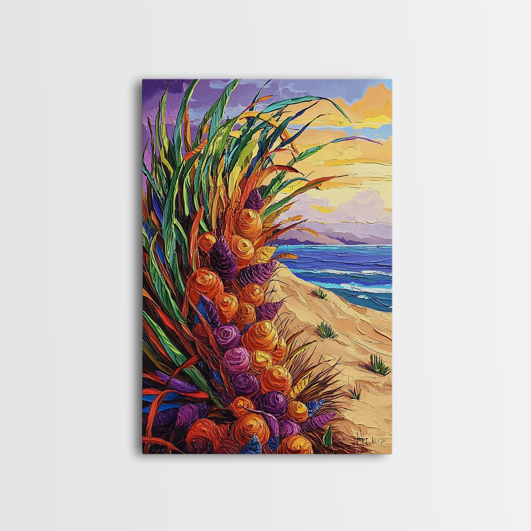 Coastal Blooms, Beach Flowers, Colorful Sunset, Nature Texture, Framed Canvas Print, Bathroom Wall Art, Modern Floral Art, Summer Decor