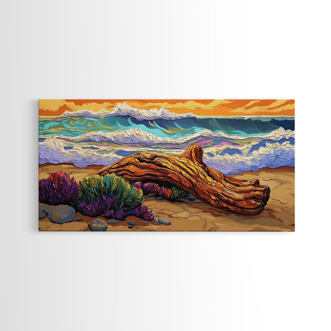 Coastal Driftwood, Waves, Sunset, Framed Canvas Print, ocean beach decor, colorful seascape, tropical wall art, living room wall art