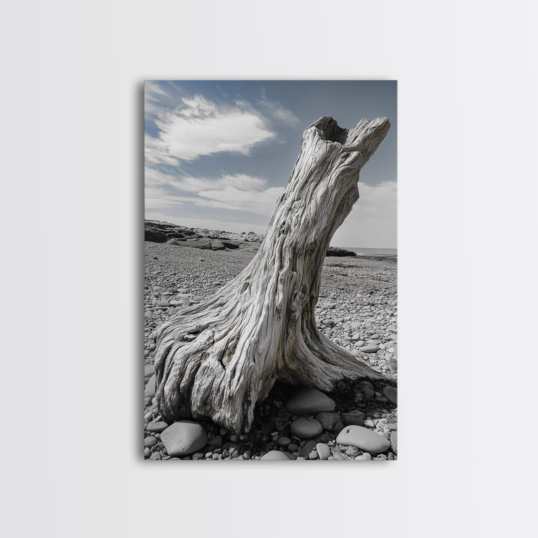 Coastal Driftwood, Beach Stump, Pebble Shore, Framed Canvas Print, Rustic Wall Art, Bathroom Decor, Earthy Beach House Accent