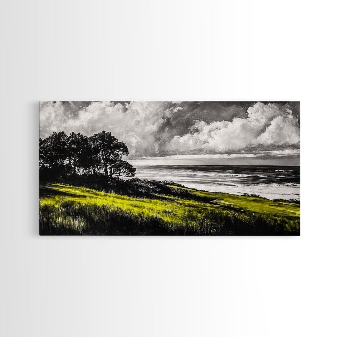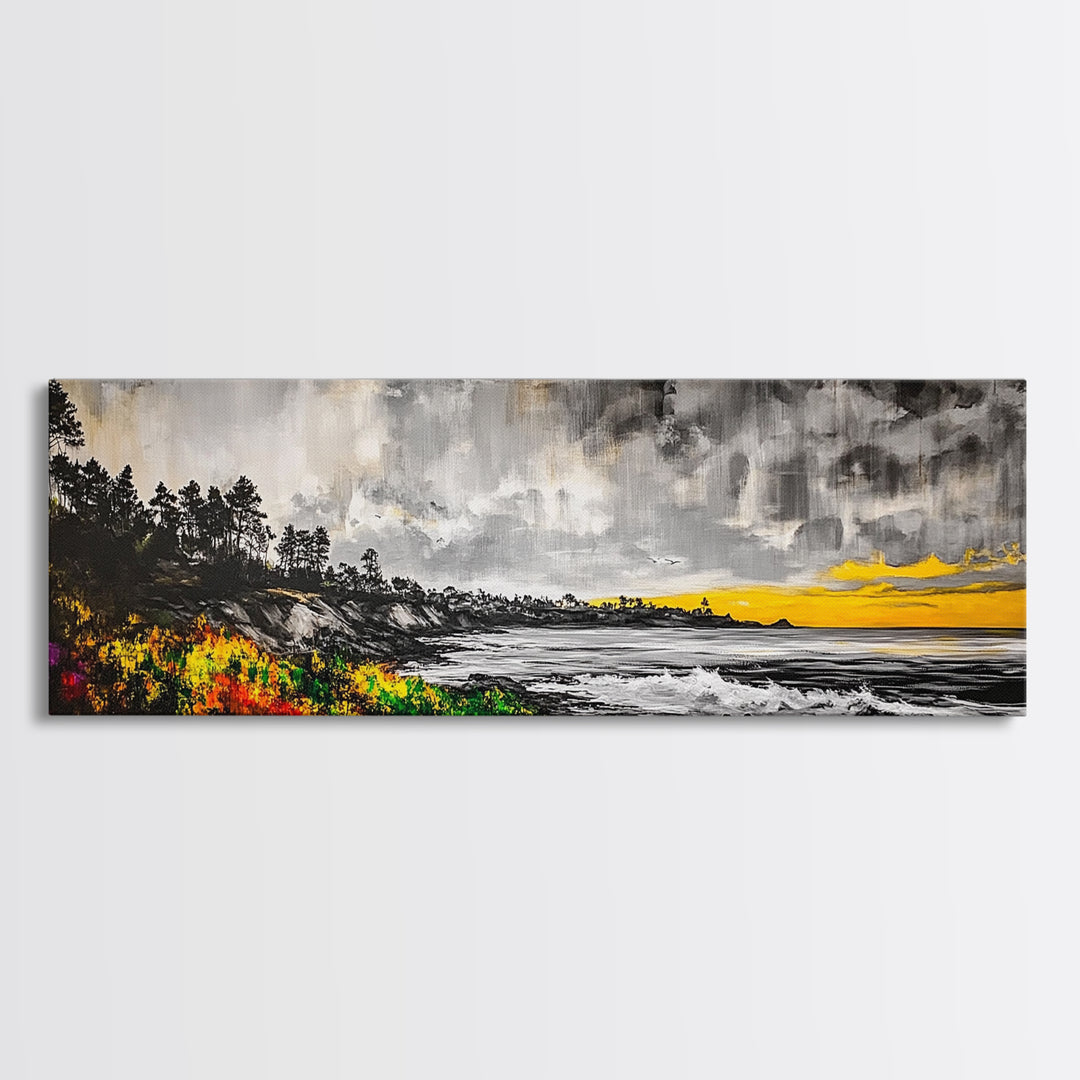 Coastal Landscape, Dramatic Seaside Art, Stormy Sky, Sunset Glow, Black and White, Vibrant Color, Modern Home Decor, Framed Canvas Print
