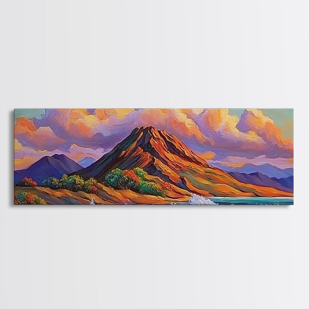 Coastal Mountains, Vibrant Landscape, Tropical Shore, Framed Canvas Print, Living Room Wall Art, Nature Inspired Decor, Bold Colors