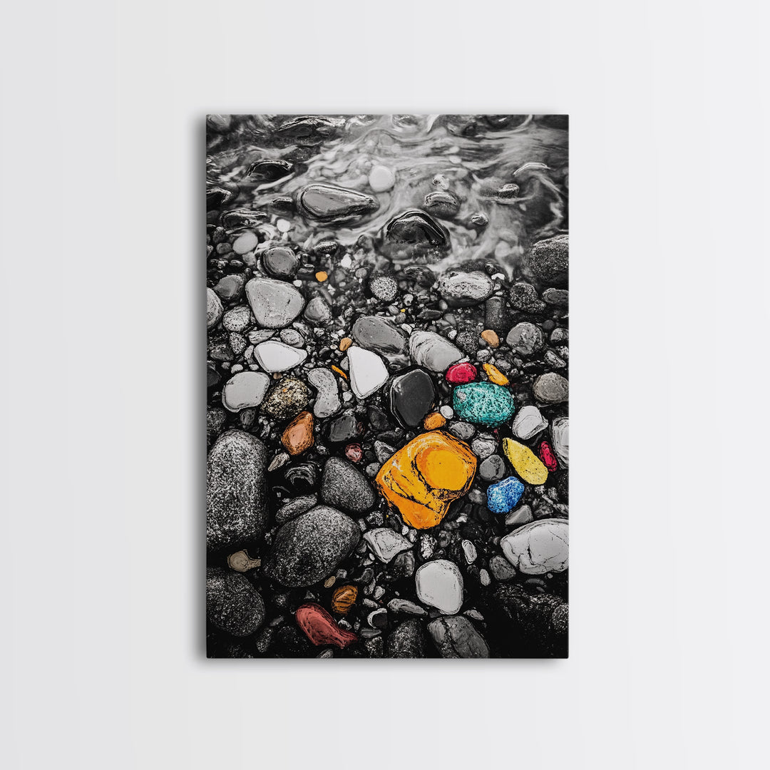Coastal Rock Art, Abstract Pebble Painting, Colorful River Stones, Modern Home Decor, Framed Canvas Print, Office or Entryway Wall Art