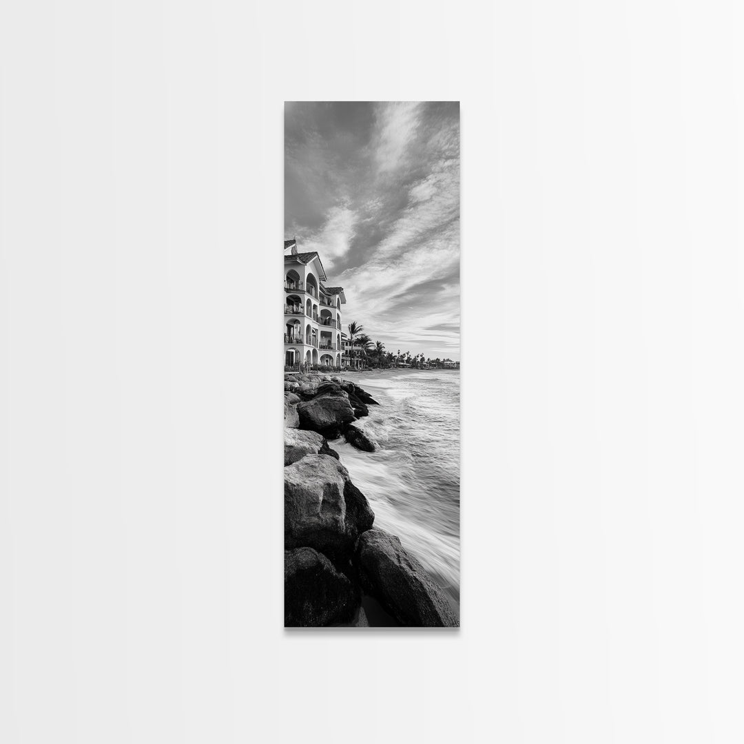 Coastal Resort Scene, Waves Rocks Hotel, Tropical Vacation Art, Beach House Wall Decor, Canvas Print, Living Room Style, Coastal Minimalist