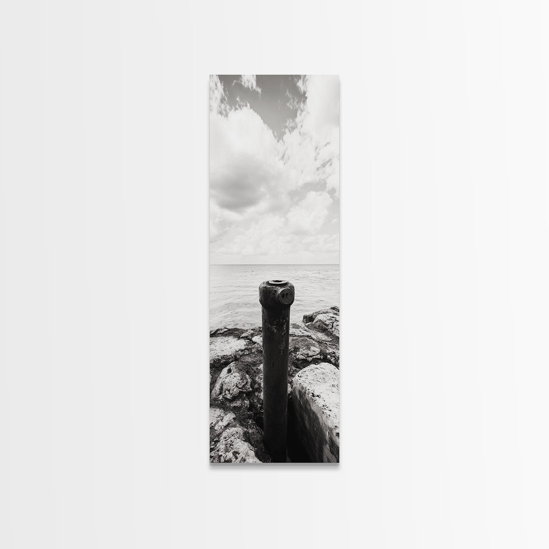 Coastal Pipe, Ocean View, Rusted Metal, Framed Canvas Print, Industrial Nautical Art, Bathroom Wall Decor, Minimal Seaside Landscape