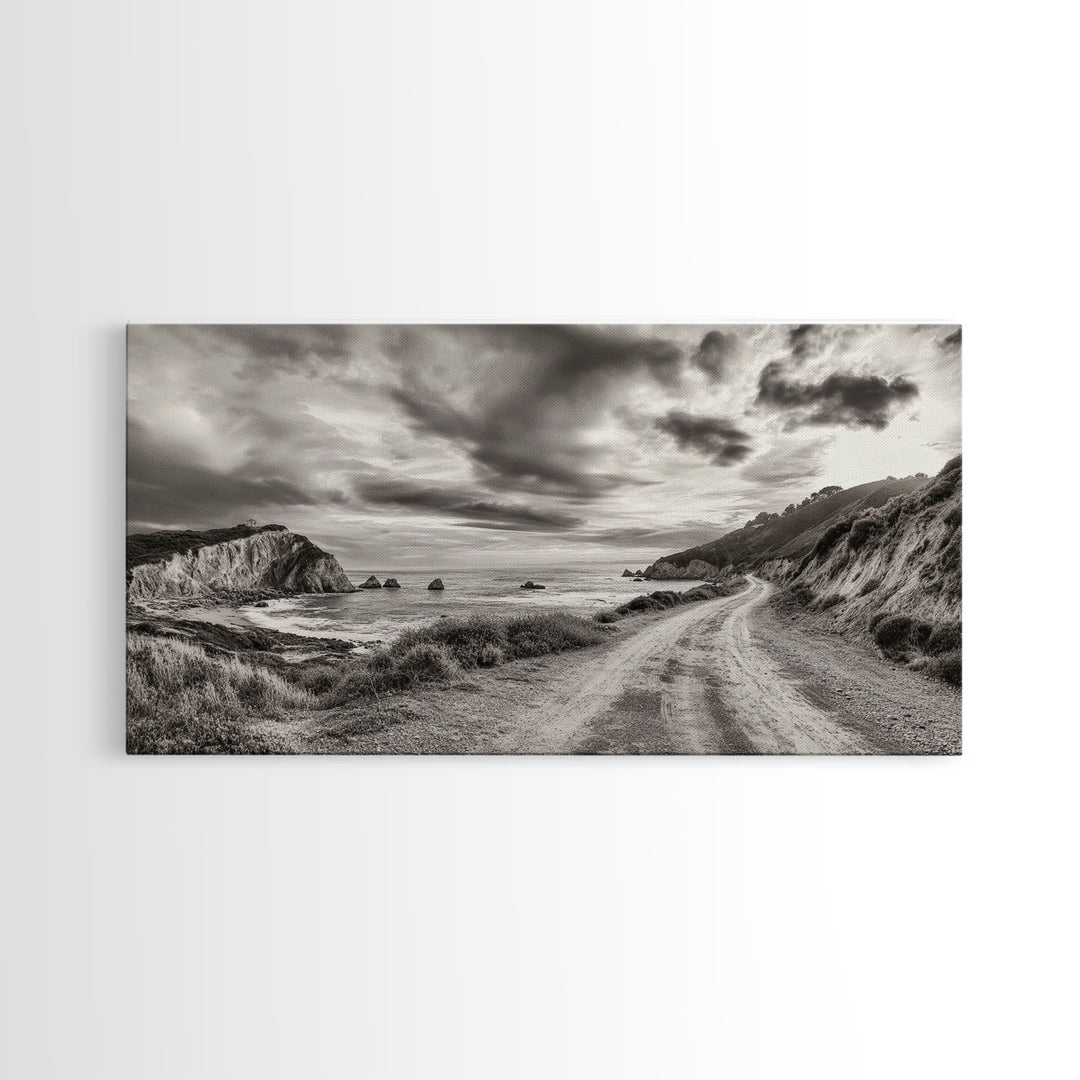Coastal Road Curve, Rugged Cliff Path, Dramatic Seascape, Canvas Print, Office Wall Art, Monochrome Nature Art, Rustic Home Decor