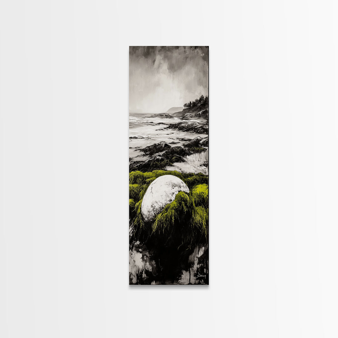 Coastal Rocks, Mossy Shore, Framed Canvas Print, Ocean Landscape, Beach House Wall Art, Nautical Decor, Green Nature, Relaxing Art