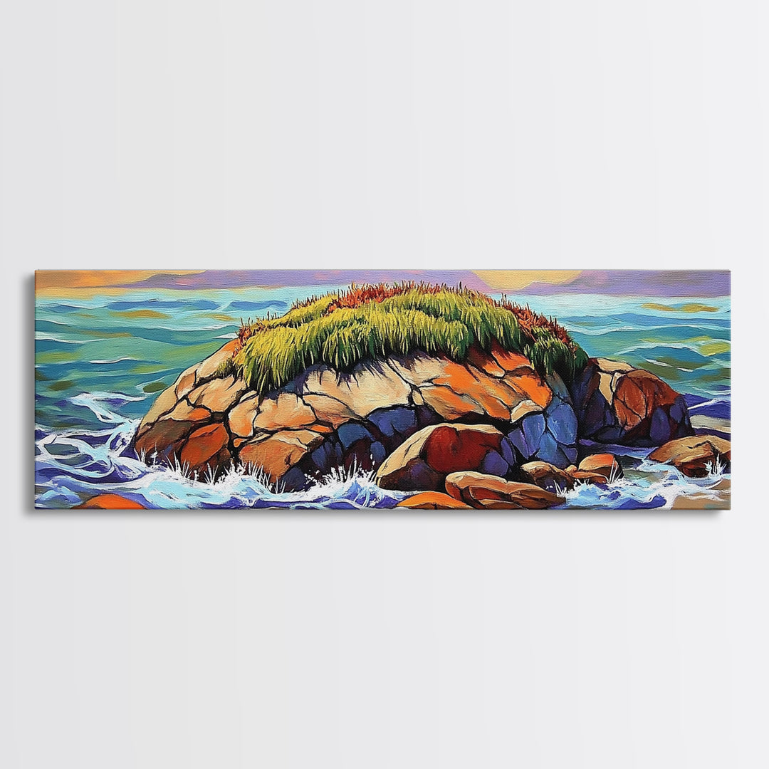 Coastal Rock Island, Colorful Ocean Landscape, Serene Seaside Wall Art, Framed Canvas Print, Nautical Living Room or Bathroom Decor