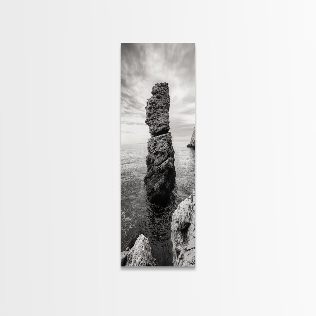 Coastal Rock, Ocean Tower, Nature Photography, Framed Canvas Print, Minimalist Wall Decor, Living Room Wall Art, Black and White Seascape