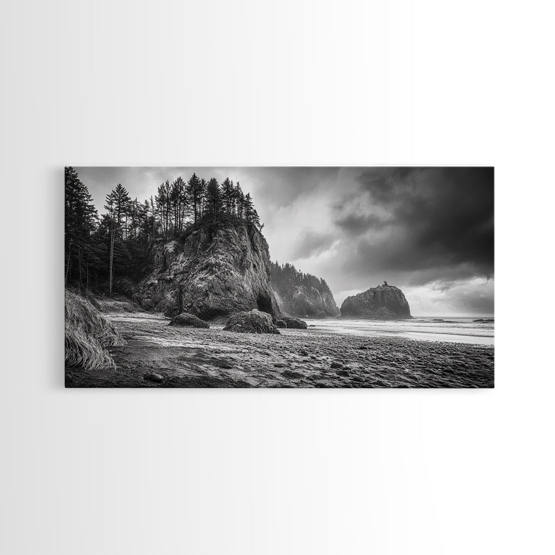 Coastal Rocks, Forest Cliffs, Moody Ocean, Framed Canvas Print, Pacific Northwest Wall Art, Dramatic Seascape, Autumn Nature Photography