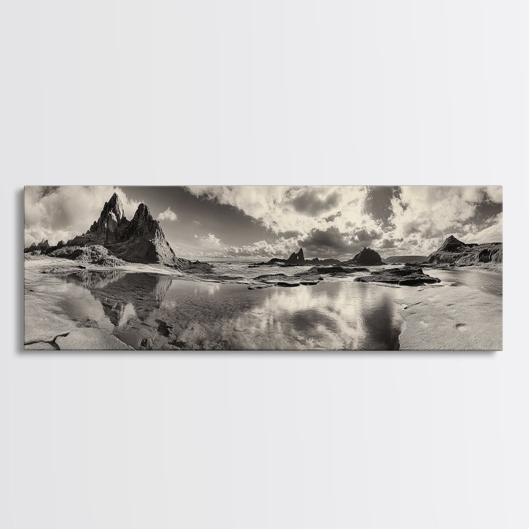 Coastal Rock Reflections, Nature Photography, Ocean Landscape, Framed Canvas Print, Moody Living Room Art, Minimal Decor