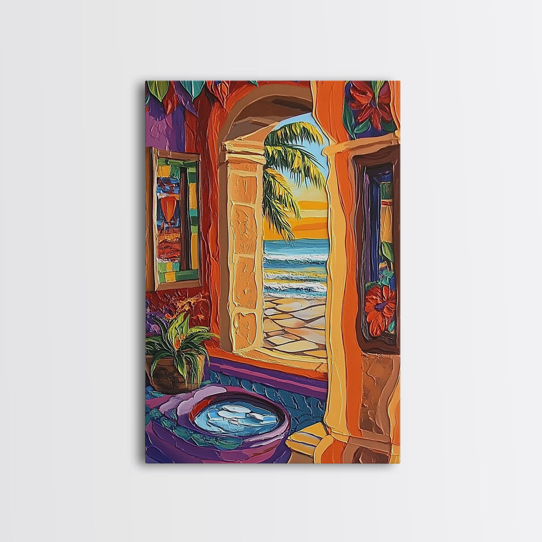 Coastal View, Archway, Interior, Framed Canvas Print, Tropical Seaside Wall Art, Bathroom or Entryway Decor, Colorful Boho Home Style