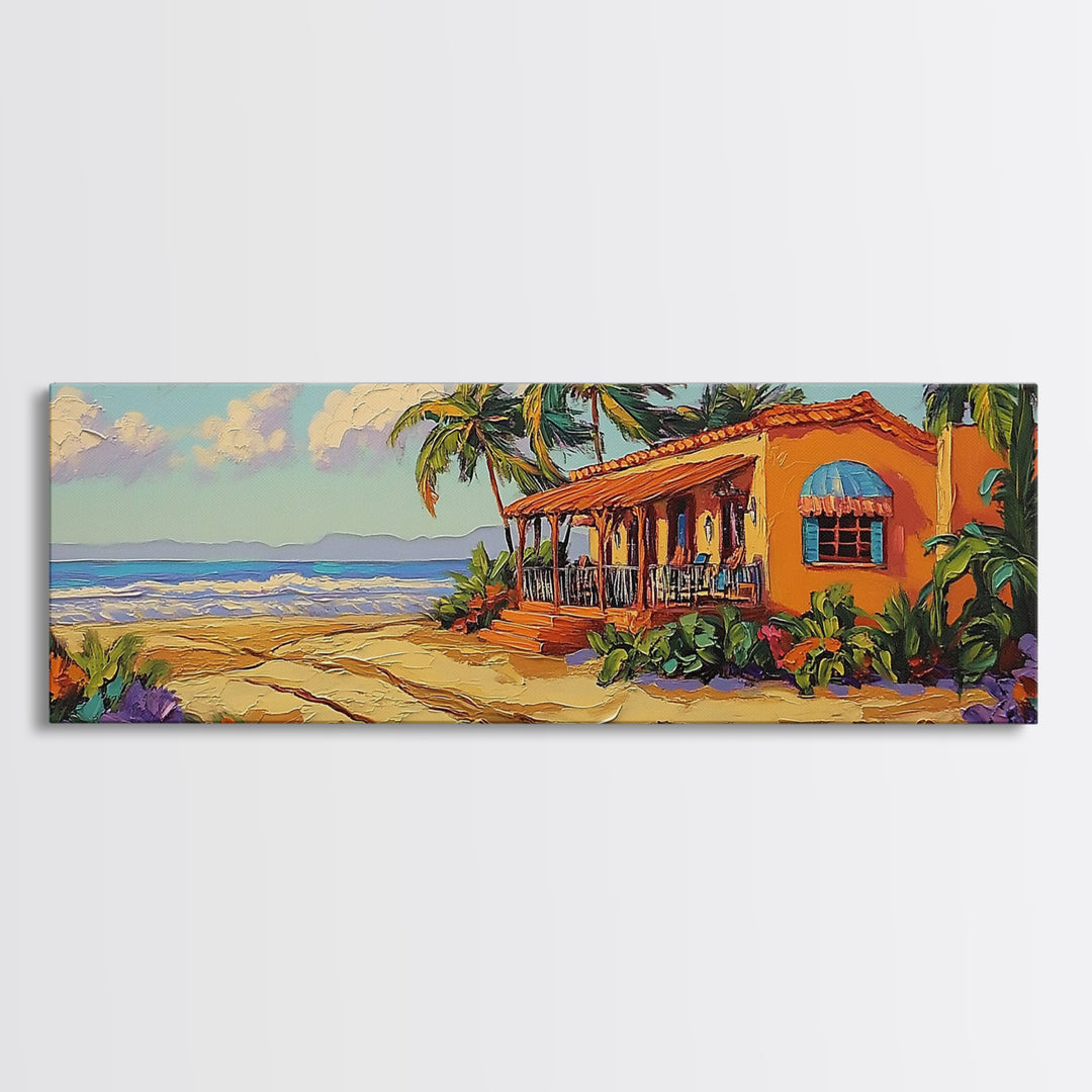 Coastal Villa Painting, Tropical Beach House, Canvas Print, Colorful Seaside Decor, Living Room or Entryway Wall Art