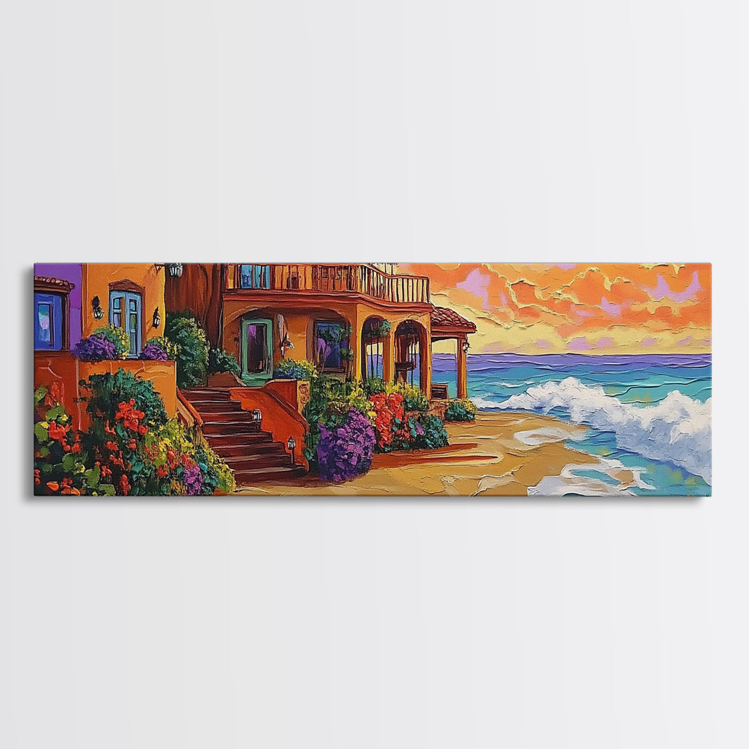 Coastal Villa, Ocean View, Sunset Beach, Canvas Print, Mediterranean house art, colorful seaside decor, boho kitchen art