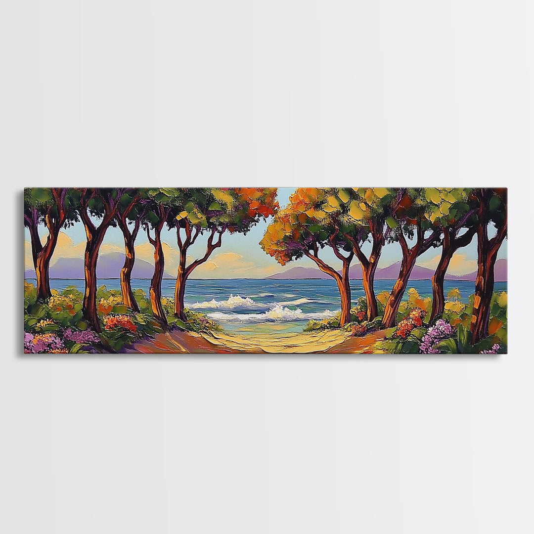 Coastal Trees, Ocean View, Beach Path, Vibrant Foliage, Framed Canvas Print, beach house decor, nature wall art, coastal living room style