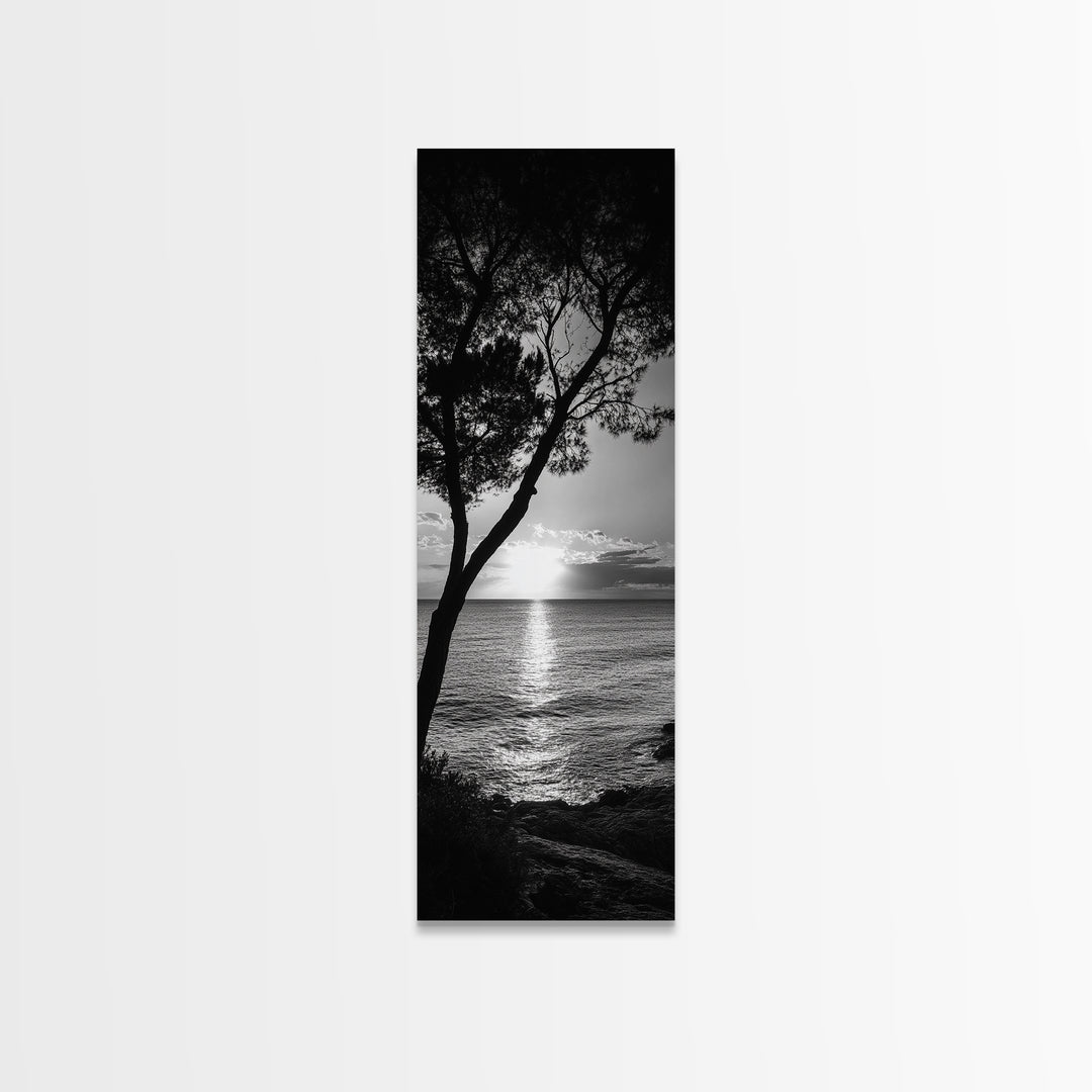 Coastal Tree, Ocean Sunset, Silhouetted Landscape, Peaceful Water, Framed Canvas Print, Nature Art, Bedroom Tranquil Decor