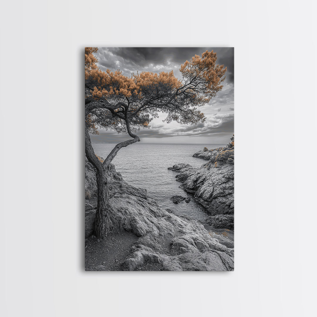 Coastal Tree, Windswept Cliff, Serene Horizon, Nature Escape, Framed Canvas Print, minimalist wall art, bedroom decor, zen nature print