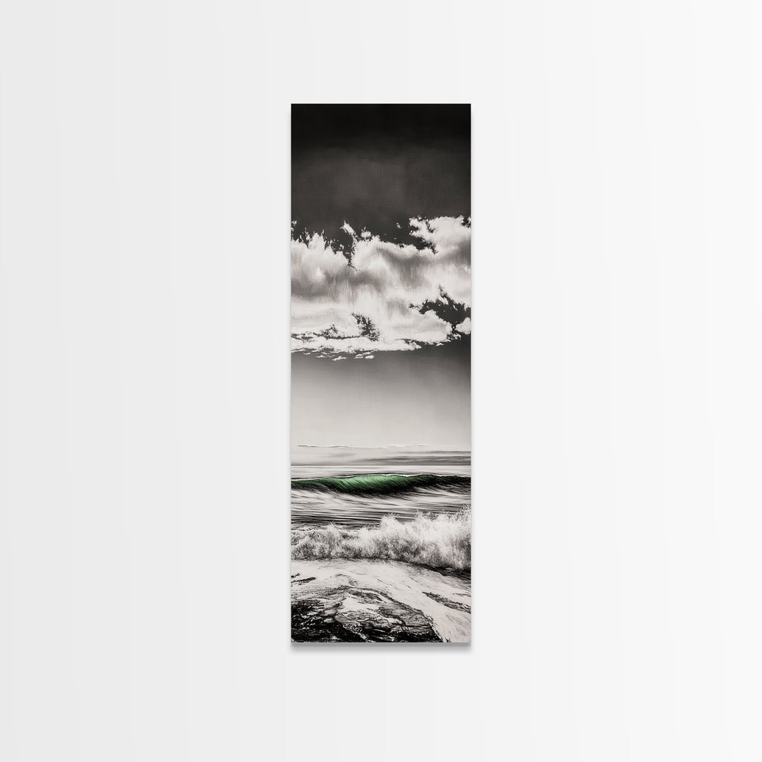 Coastal Waves, Black and White, Green Wave, Framed Canvas Print, Modern Beach Wall Art, Minimalist Ocean Decor, Living Room Art