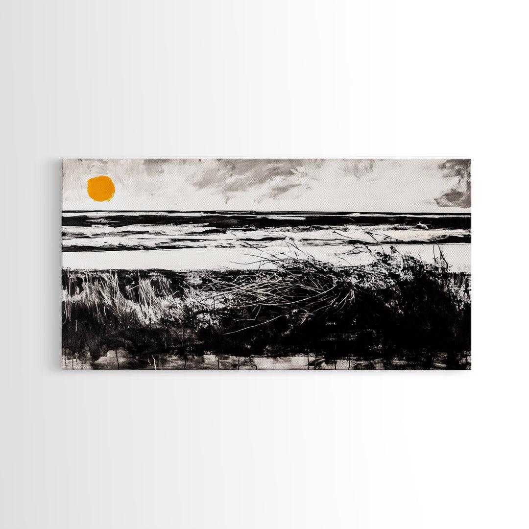 Coastal, Minimalist, Black and White, Framed Canvas Print, Ocean Sunset Wall Art, Beach House Decor, Nautical Artwork, Serene Seascape