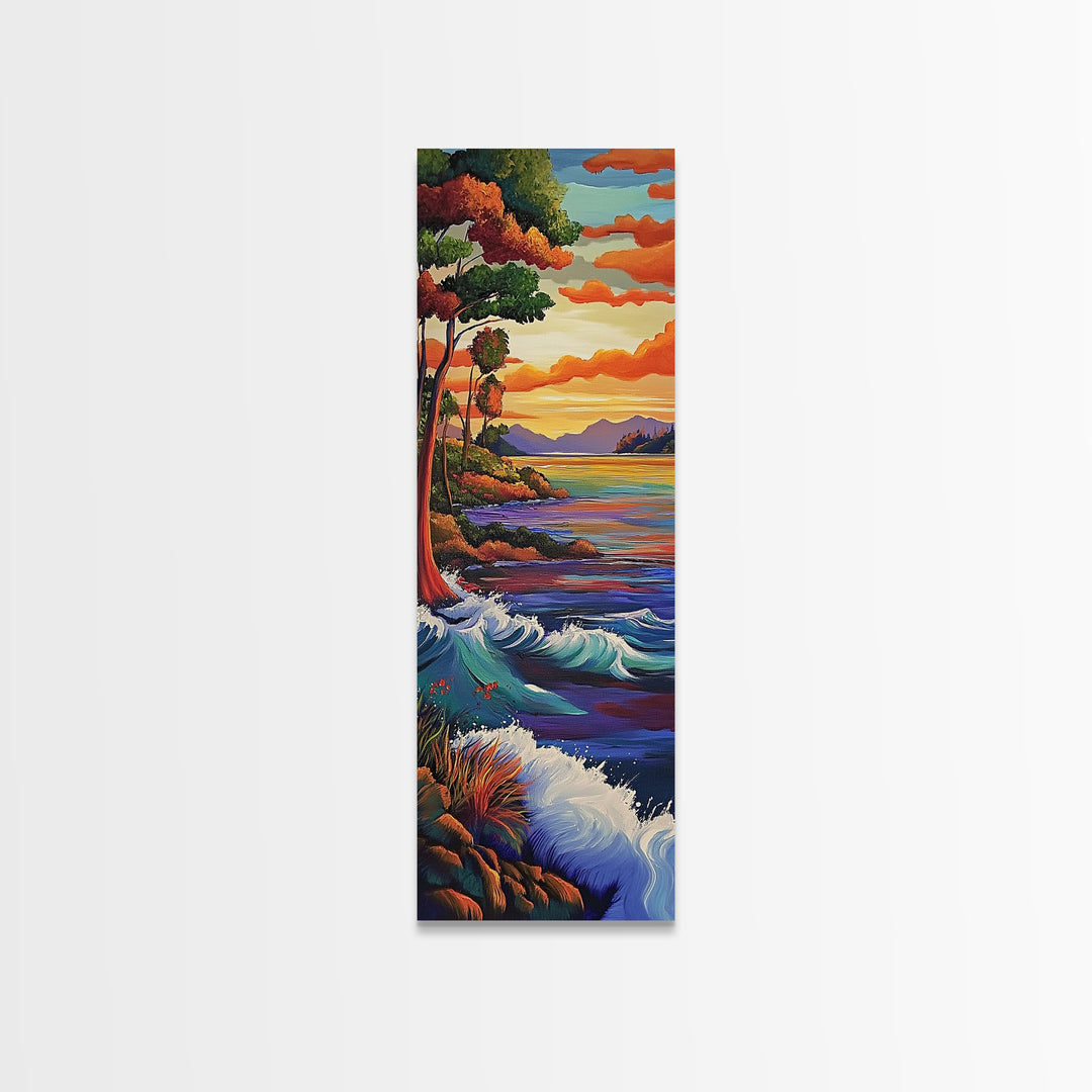 Coastal, Sunset, Trees, Ocean View Framed Canvas Print, Bold Color Landscape, Nature Wall Decor, Entryway Boho Art, Lake House Vibes