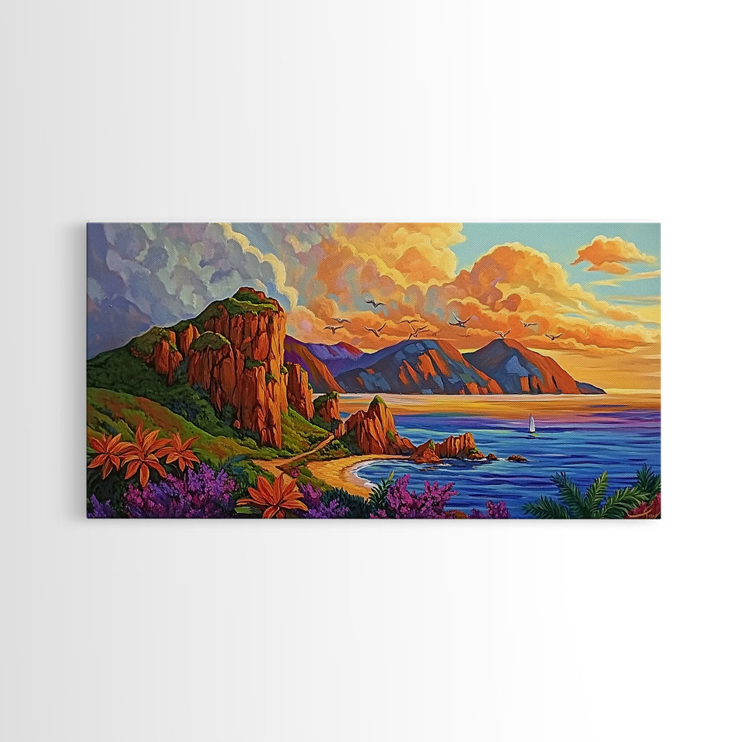 Coastline Mountains, Sunset, Landscape, Framed Canvas Print, Seascape Wall Art, Coastal Decor, Colorful Landscape, Living Room Beach Art