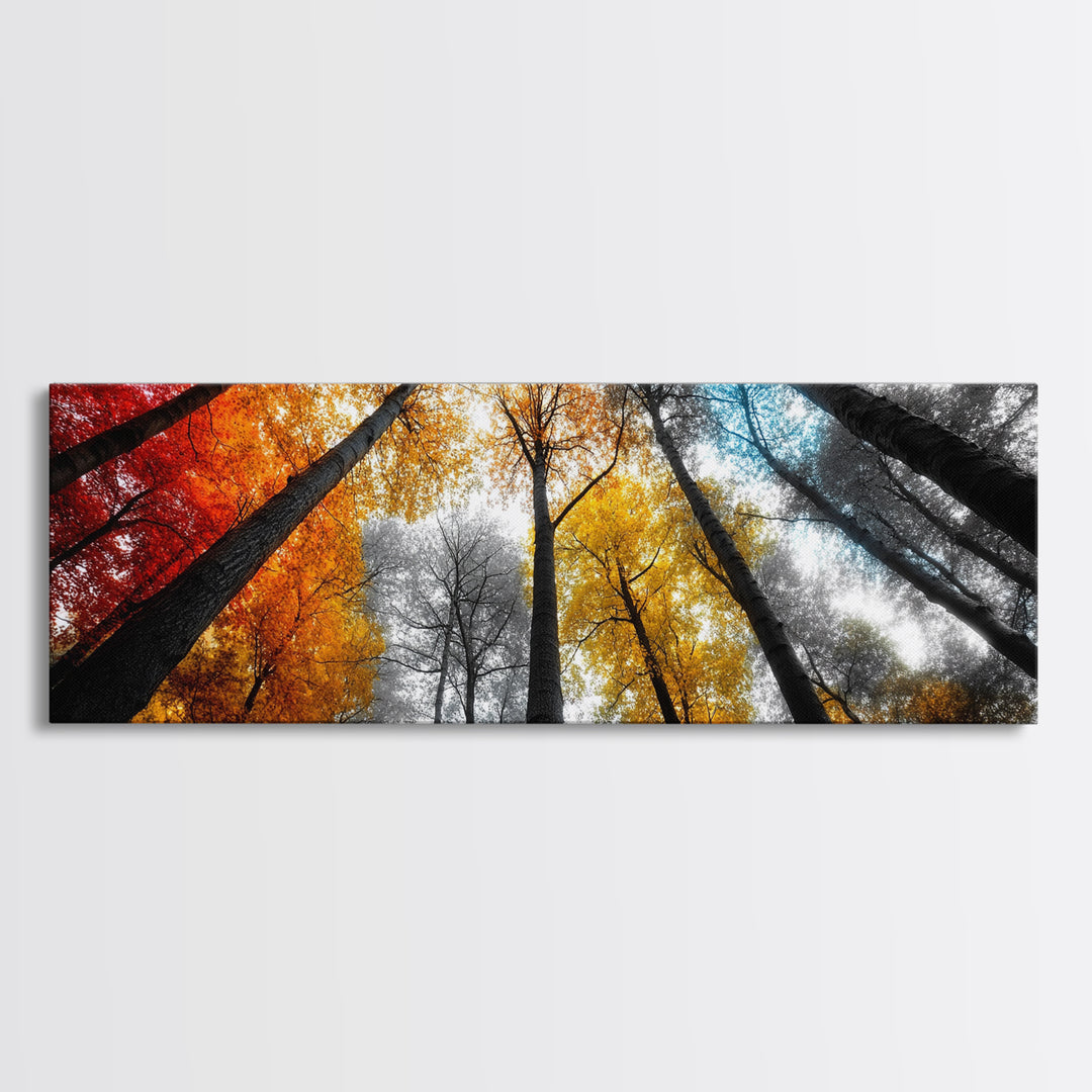 Colorful Fall Canopy, Red Yellow Leaves, Autumn Tree Art, Framed Canvas Print, Moody Forest Decor, Entryway Wall Art
