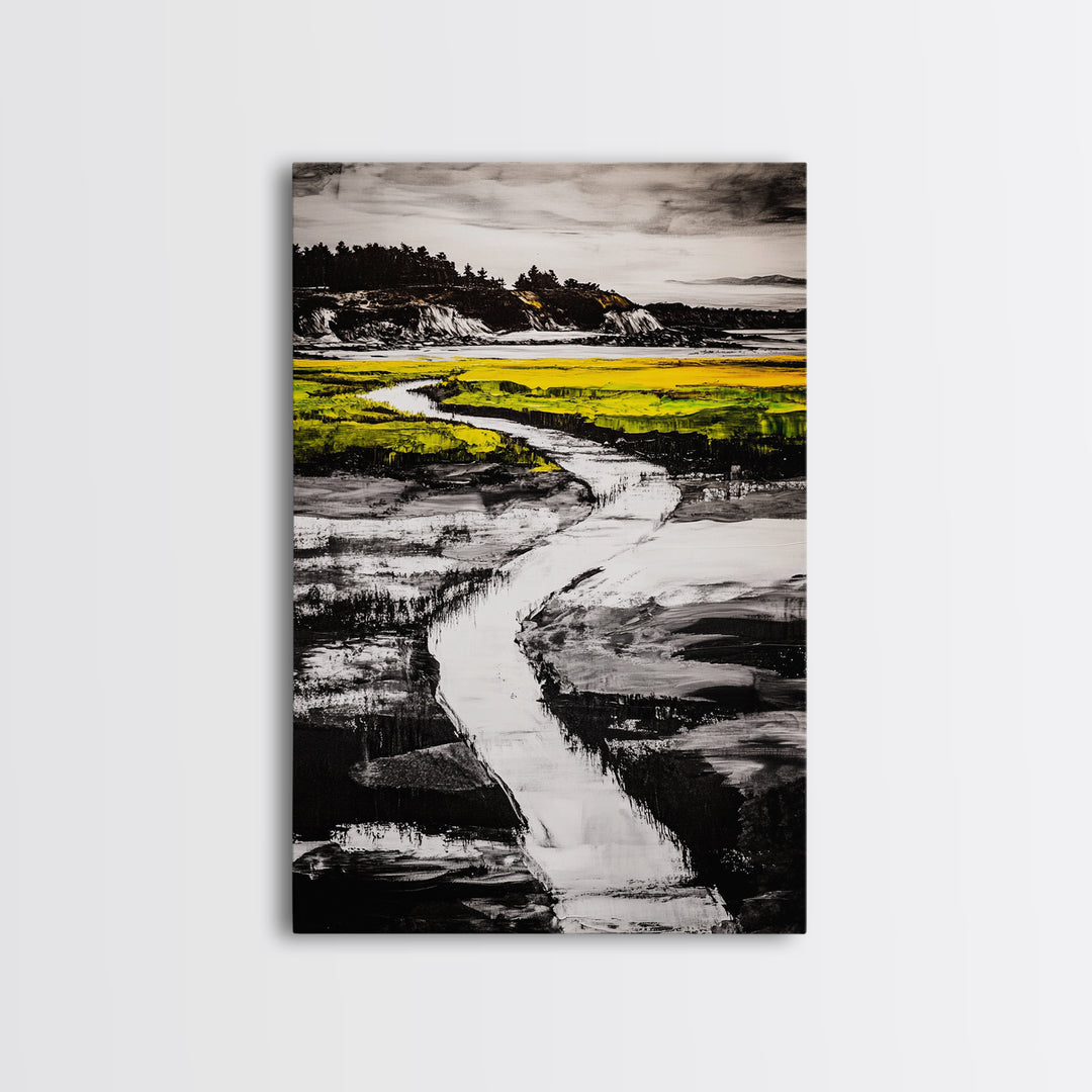 Abstract River, Nature Landscape, Modern Wall Art, Monochrome Print, Green Accents, Contemporary Art, Framed Canvas Print, Office Wall Decor