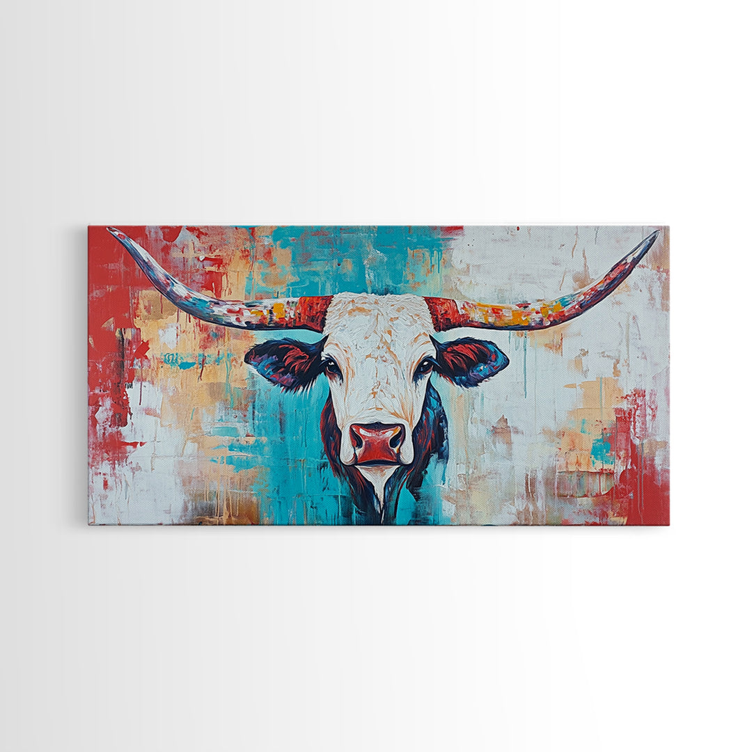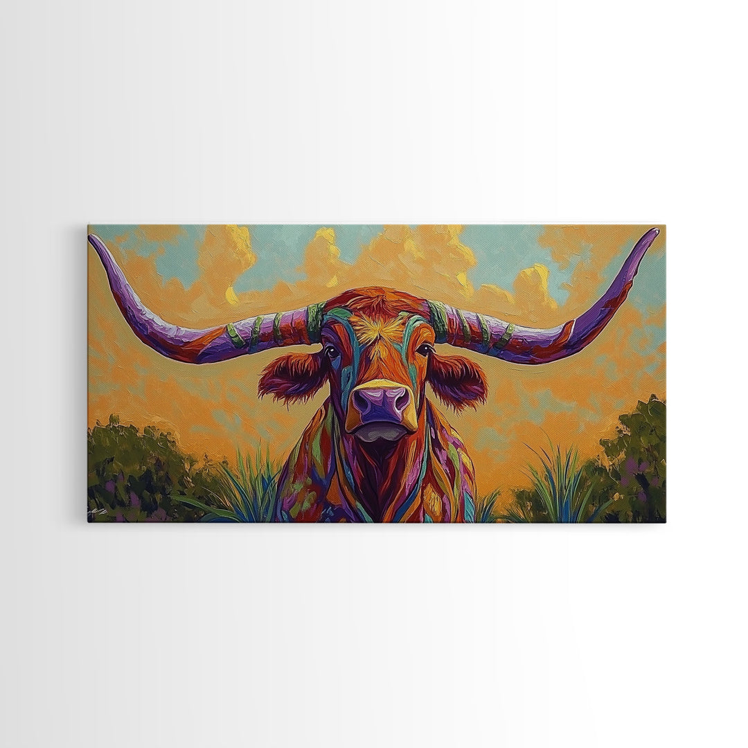 Colorful Longhorn Art, rustic wall art, farmhouse art, southwest wall art, bold animal painting, extra wide art, canvas print, wabi sabi art