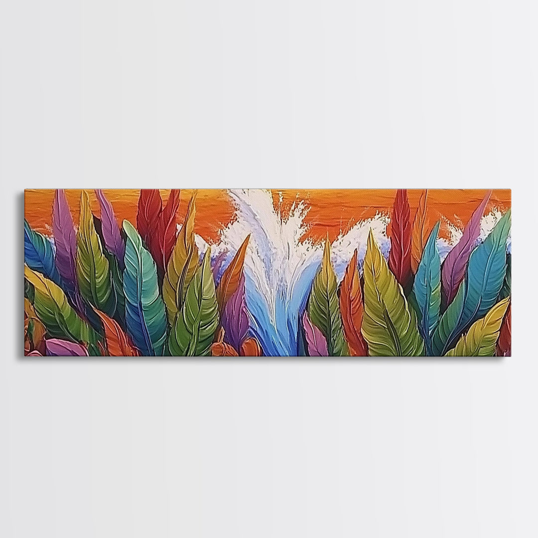 Colorful Leaf Art, Sunset Nature Decor, Vibrant Feather Design, Framed Canvas Print, Boho Wall Art, Entryway Accent Piece